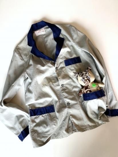 40年代のステンシル入りランドリーバッグを解体、それに70年代のデッドストックの総柄ウッドストック生地とピースマーク&DOVEのファブリックを使って製作しました。