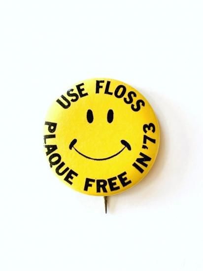 1973 "USE FLOSS PLAQUE FREE" pinback button