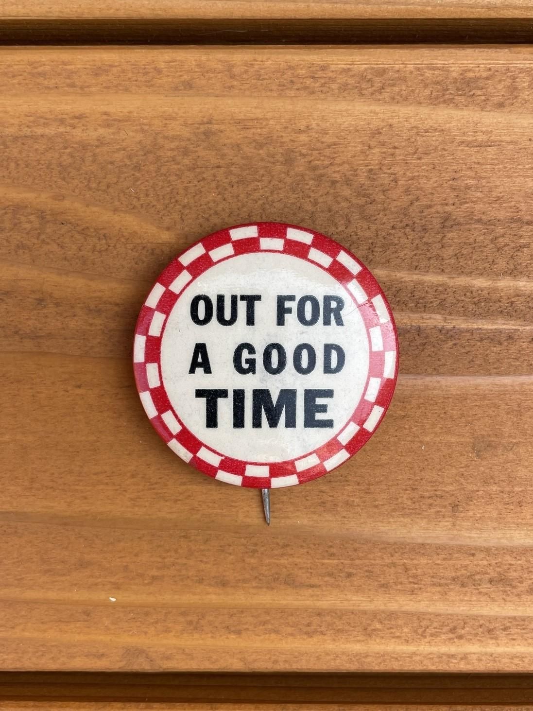 1970's "OUT FOR A GOOD TIME" CHECKERED PINBACK BUTTON