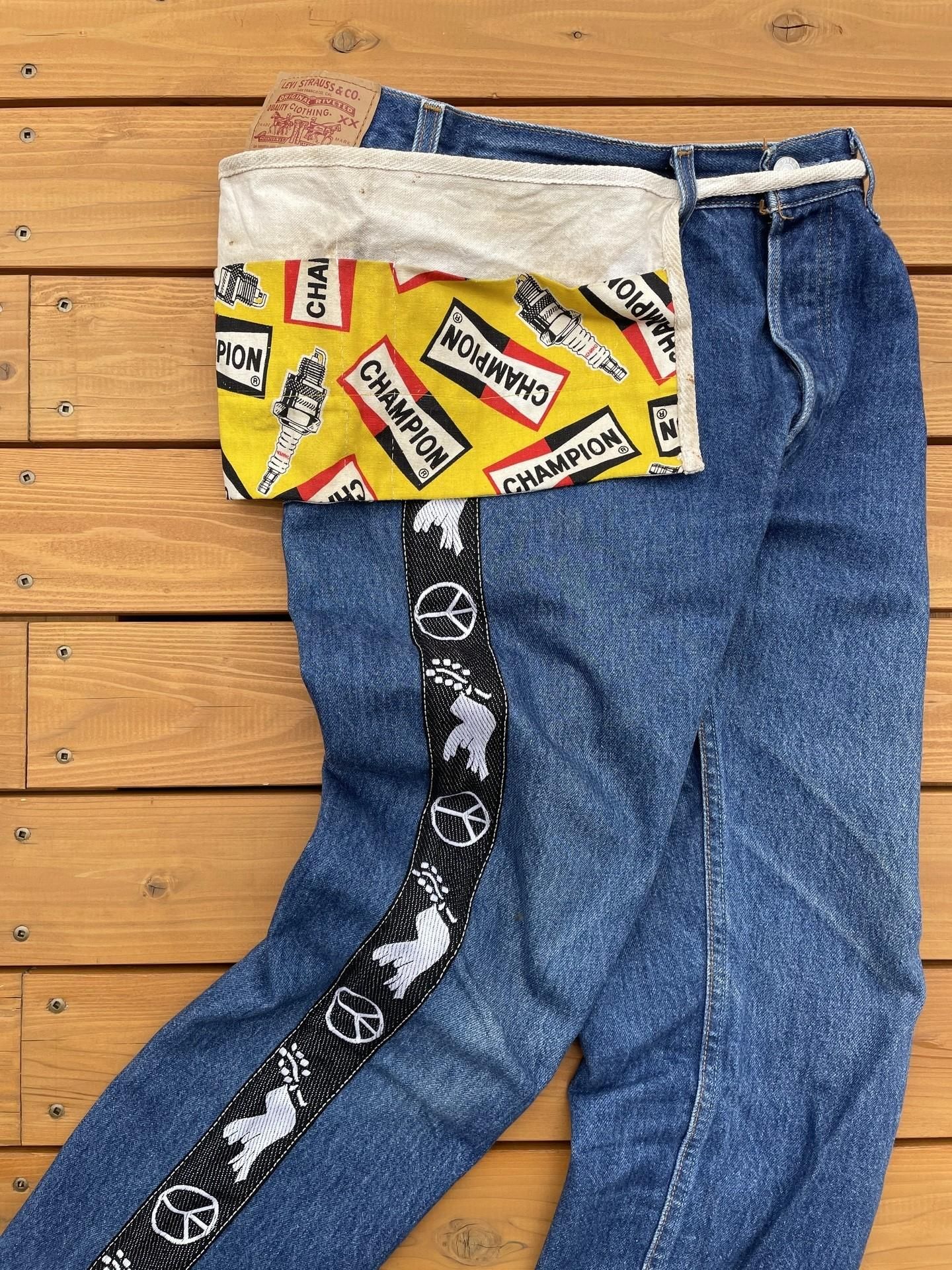 ☆ビンテージのキャンバスエプロンに、60〜70年代の『CHAMPION SPARK PLUGS』のコットンファブリックを嵌め込んだリメイクエプロンです。