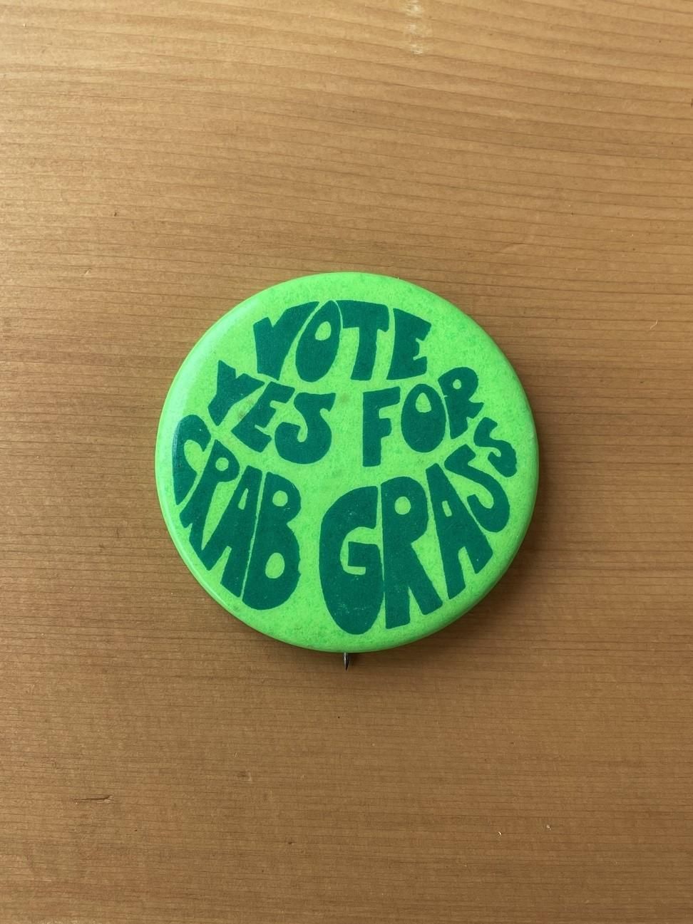 1967 "VOTE YES FOR CRAB GRASS" pinback button by PAULA