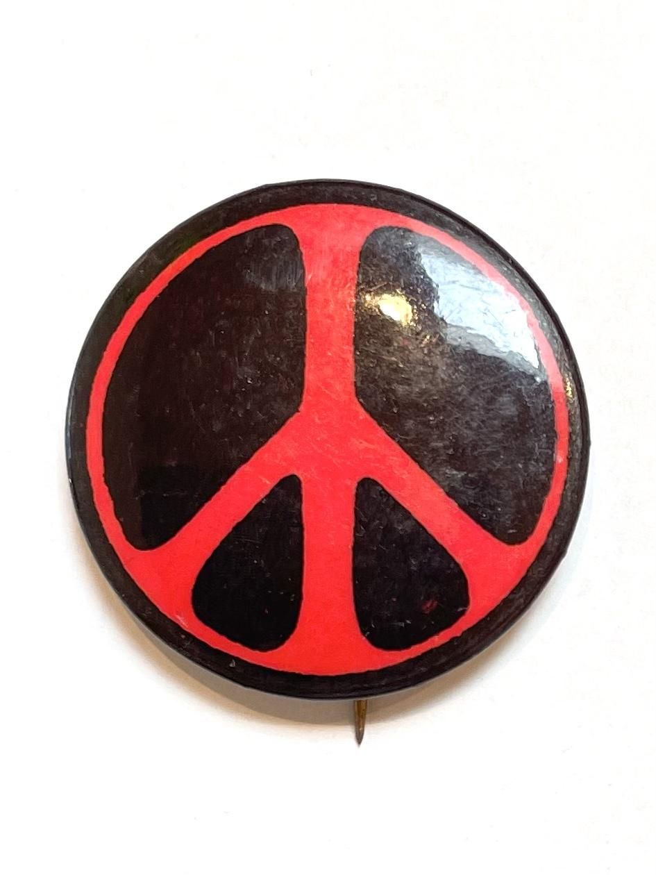 1970's "PEACE SIGN" PINBACK BUTTON by "LARRY FOX" RED