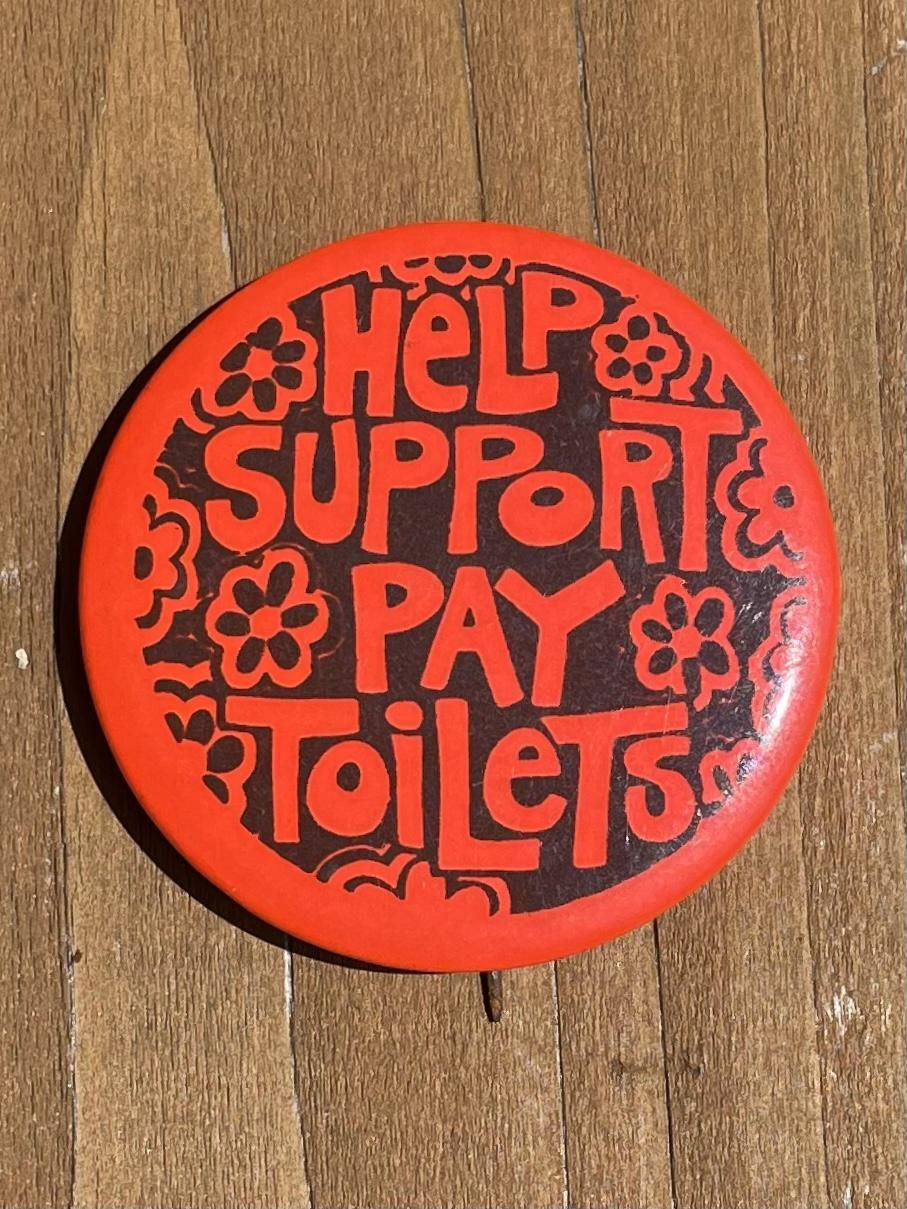 1967 "HeLP SUPPoRT PAY ToiLeTs" PINBACK BUTTON by "PAULA"