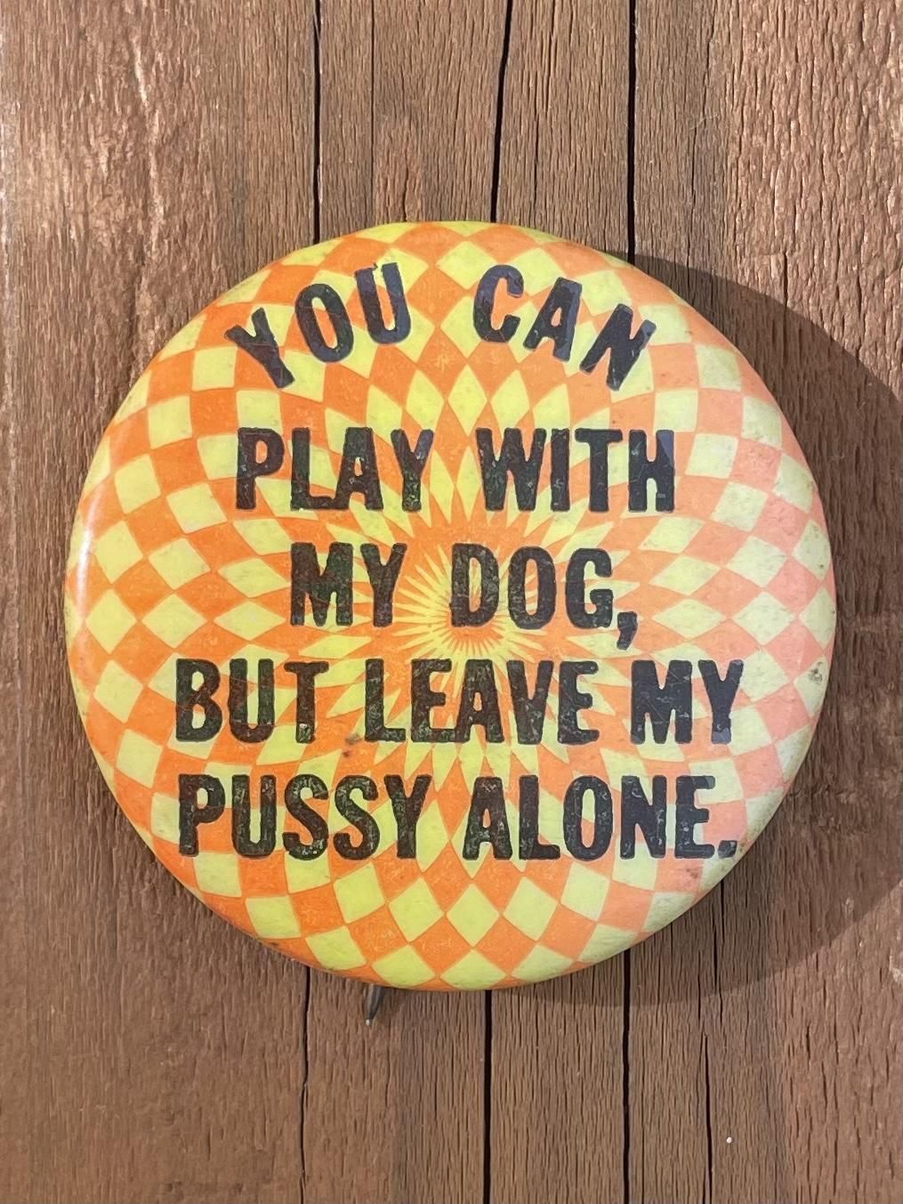 1970's "YOU CAN PLAY WITH MY DOG, BUT LEAVE MY PUSSY ALONE" PINBACK BUTTON ORANGE