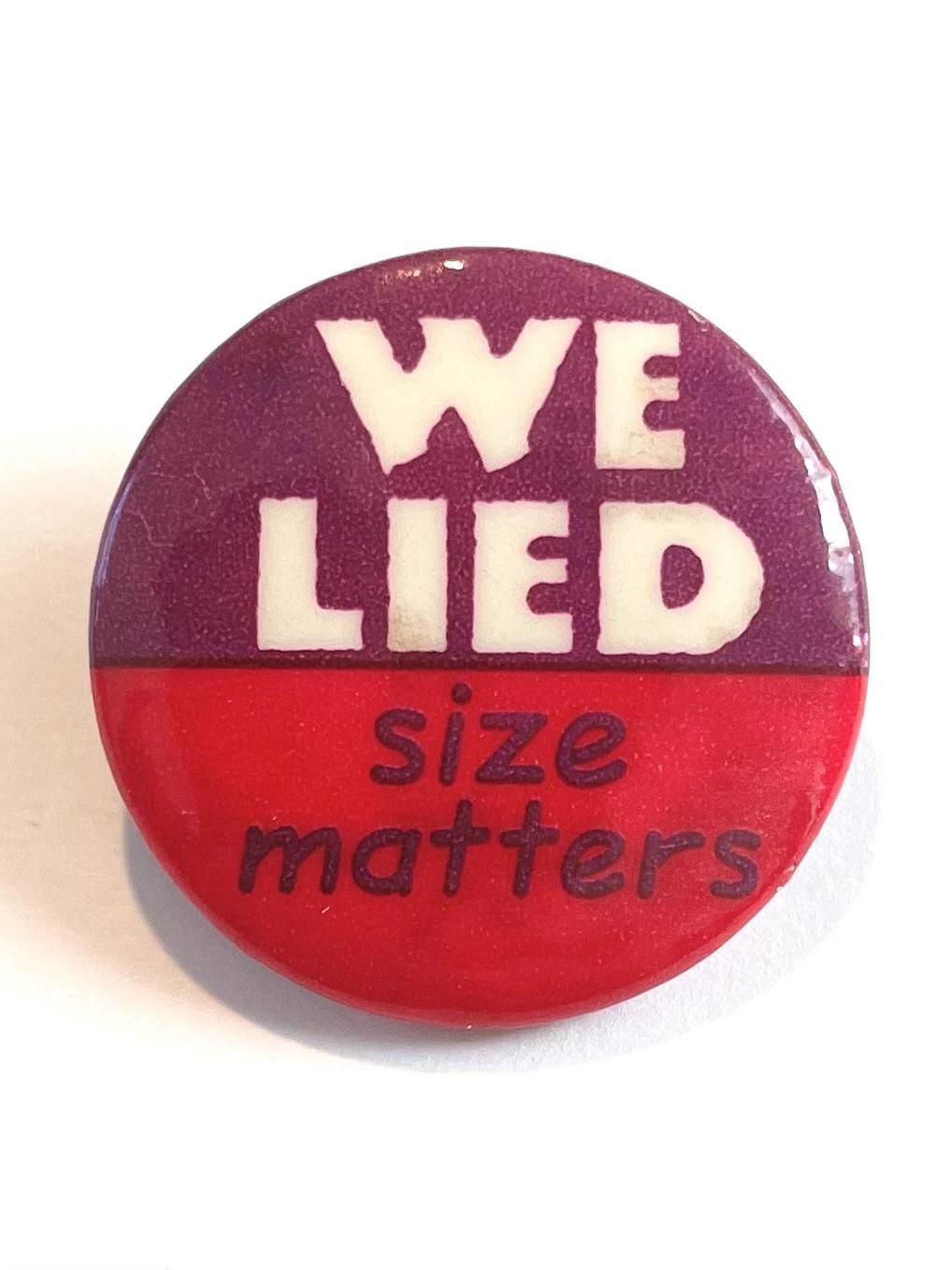 1993 "WE LIED size matters" PINBACK BUTTON