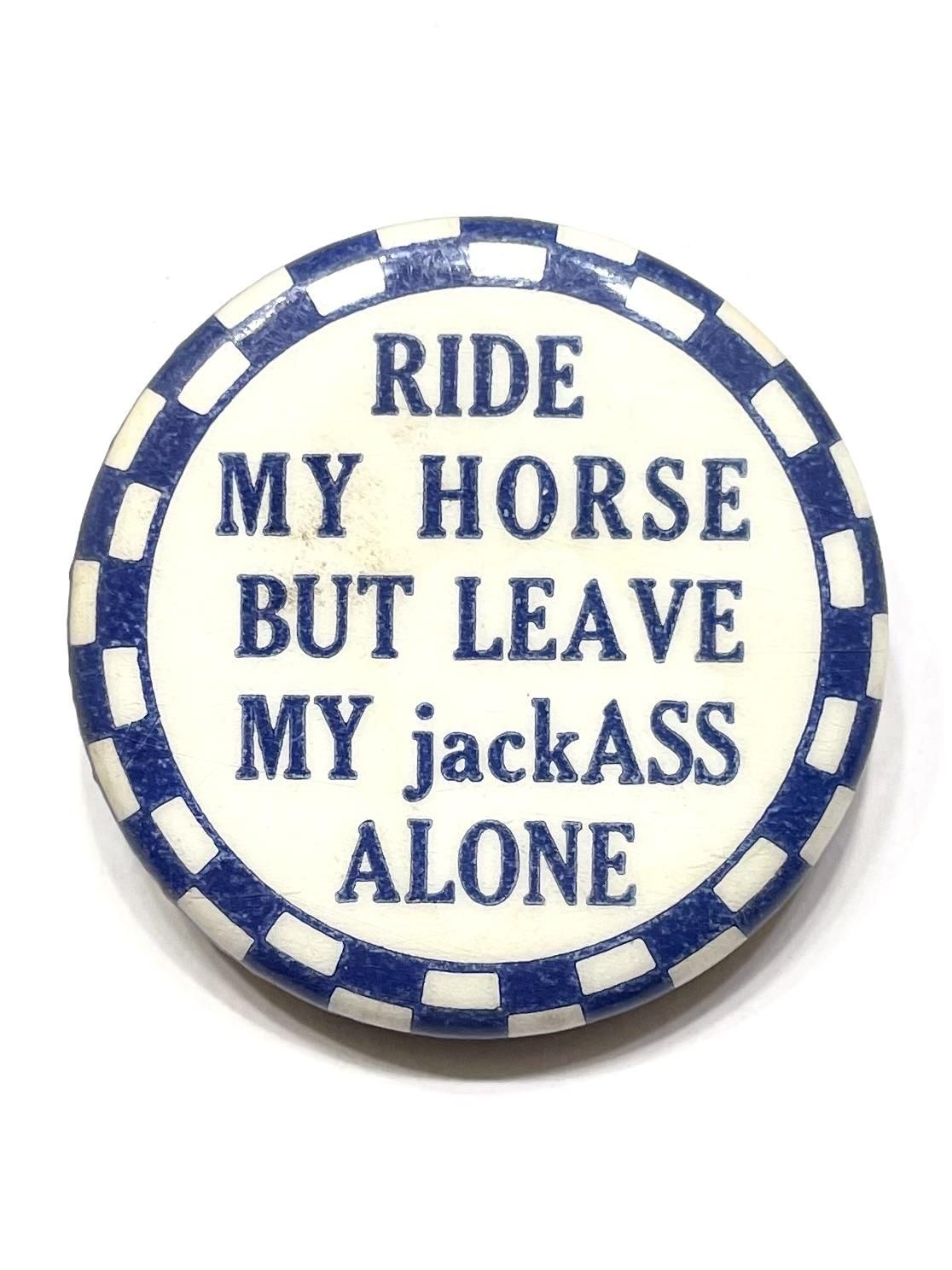 〜1950's "RIDE MY HORSE BUT LEAVE MY jackASS ALONE" checkered PINBACK BUTTON