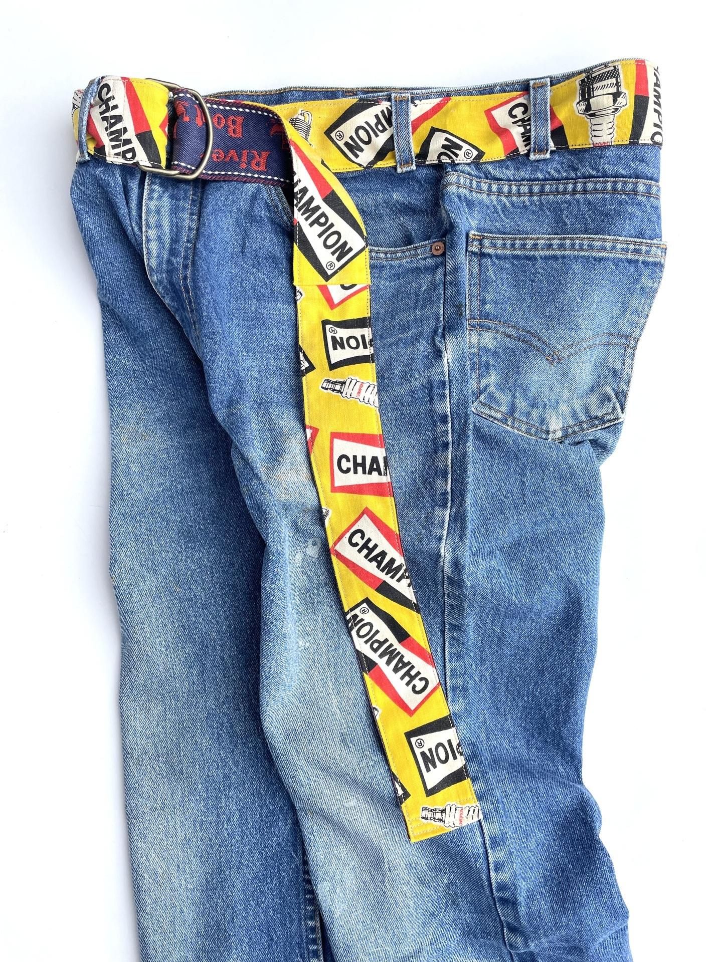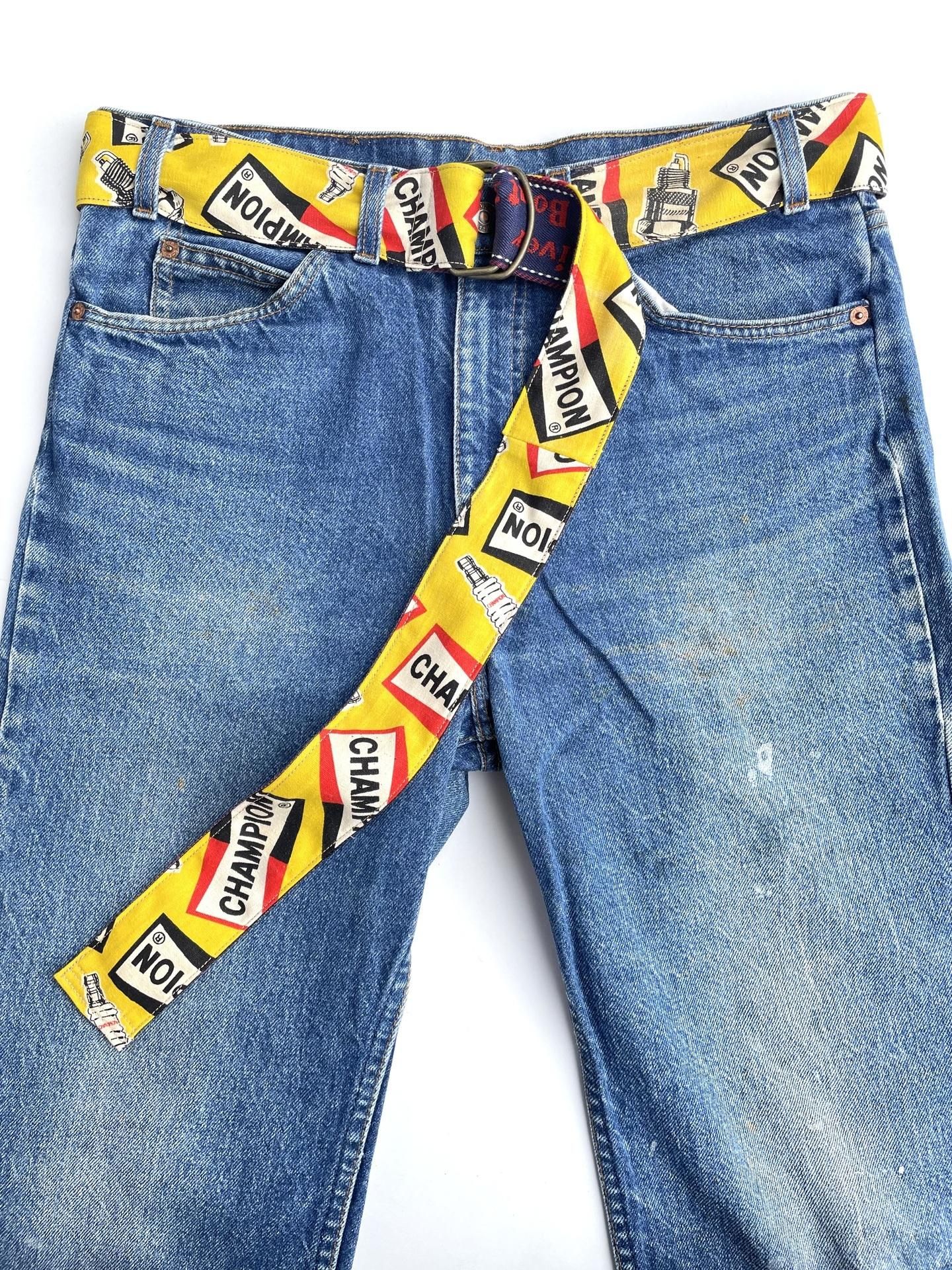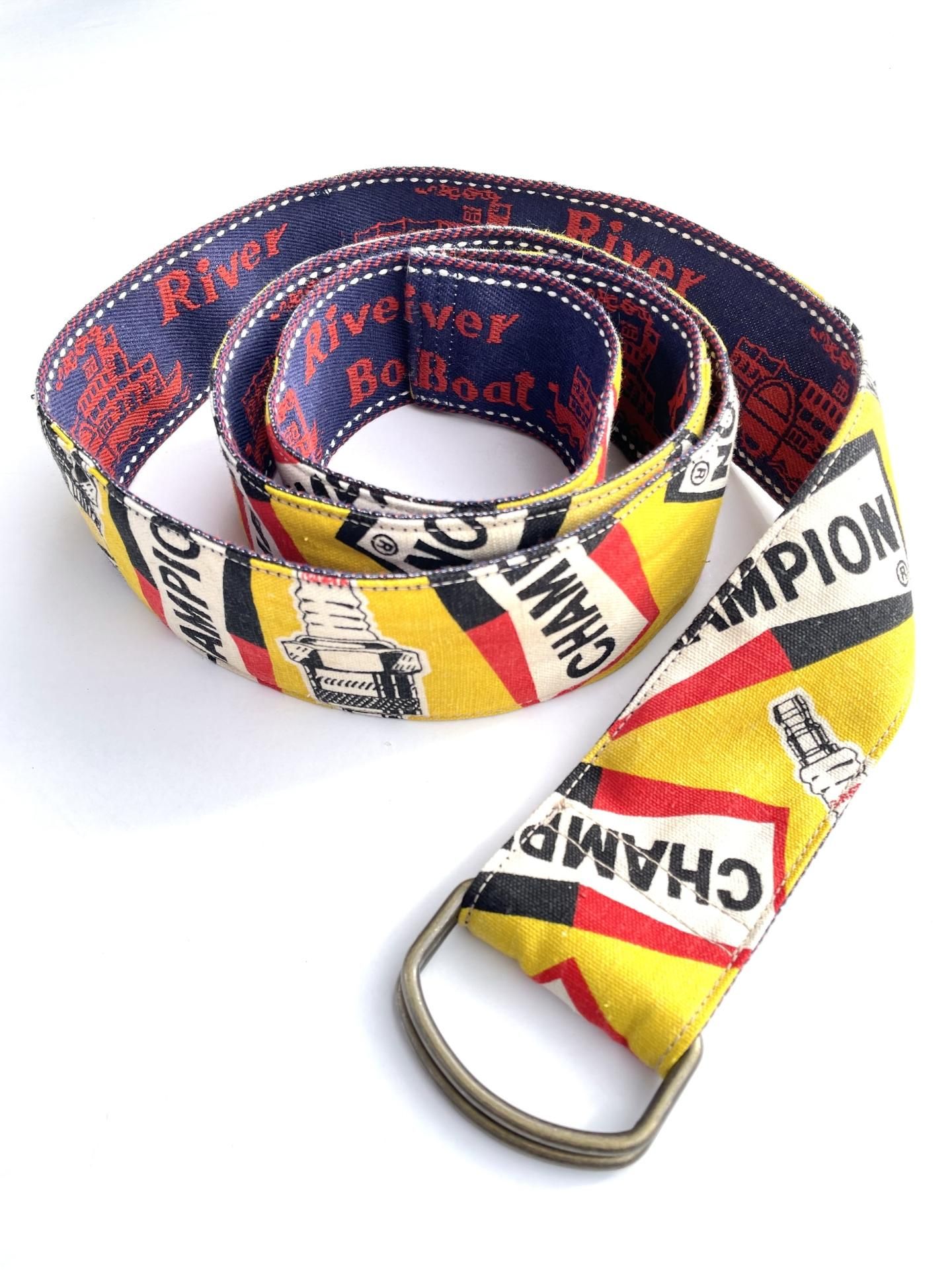 1970年代の『CHAMPION SPARK PLUGS』のファブリックと、同年代のデッドストックのデニムトリムを使って製作したリメイクベルトです☝️