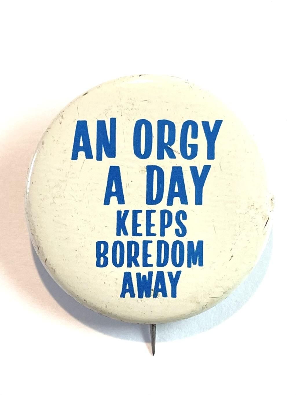 1969 "AN ORGY A DAY KEEPS BOREDOM AWAY" PINBACK BUTTON