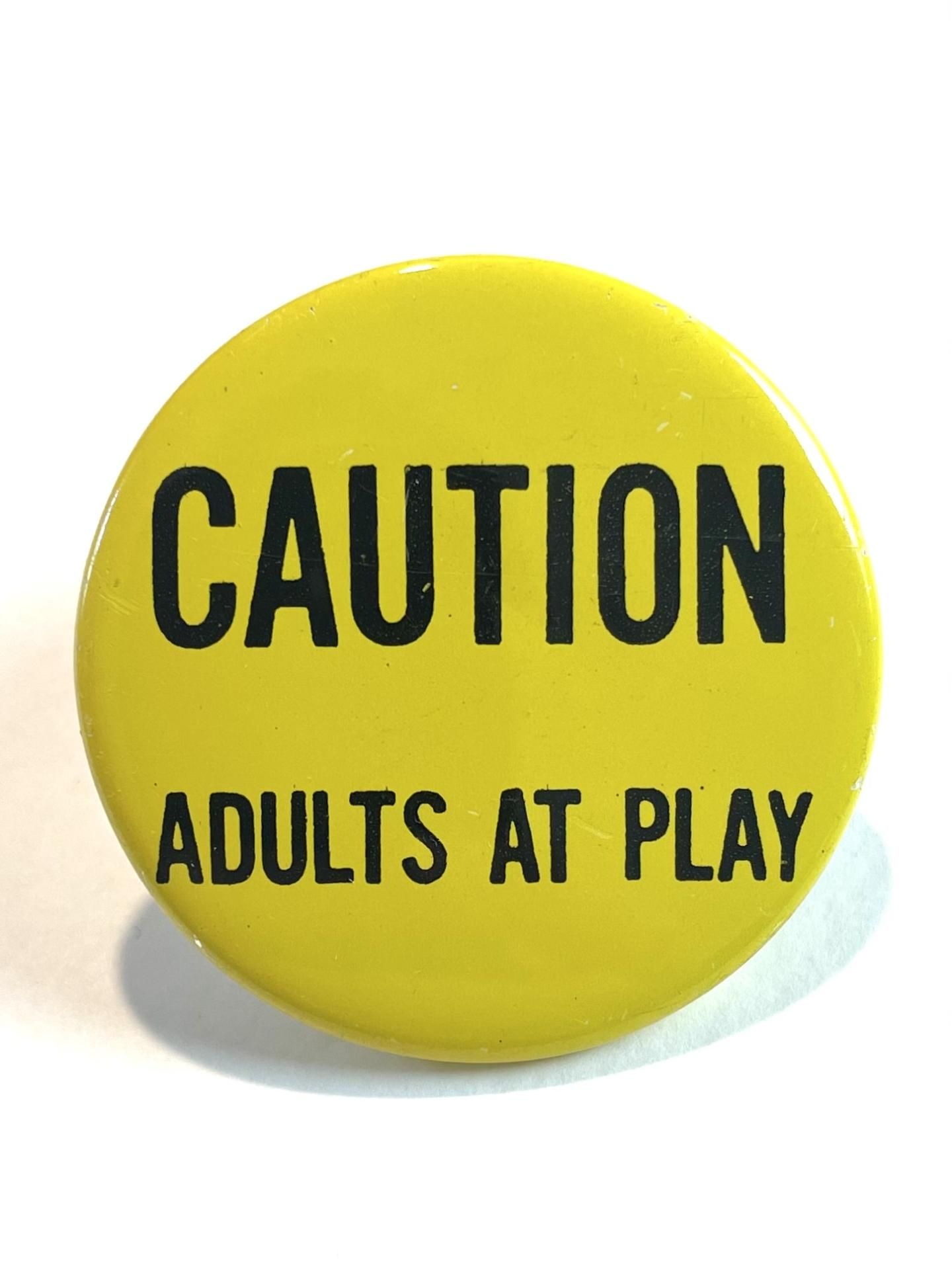 1970's "CAUTION ADULTS AT PLAY" PINBACK BUTTON YELLOW