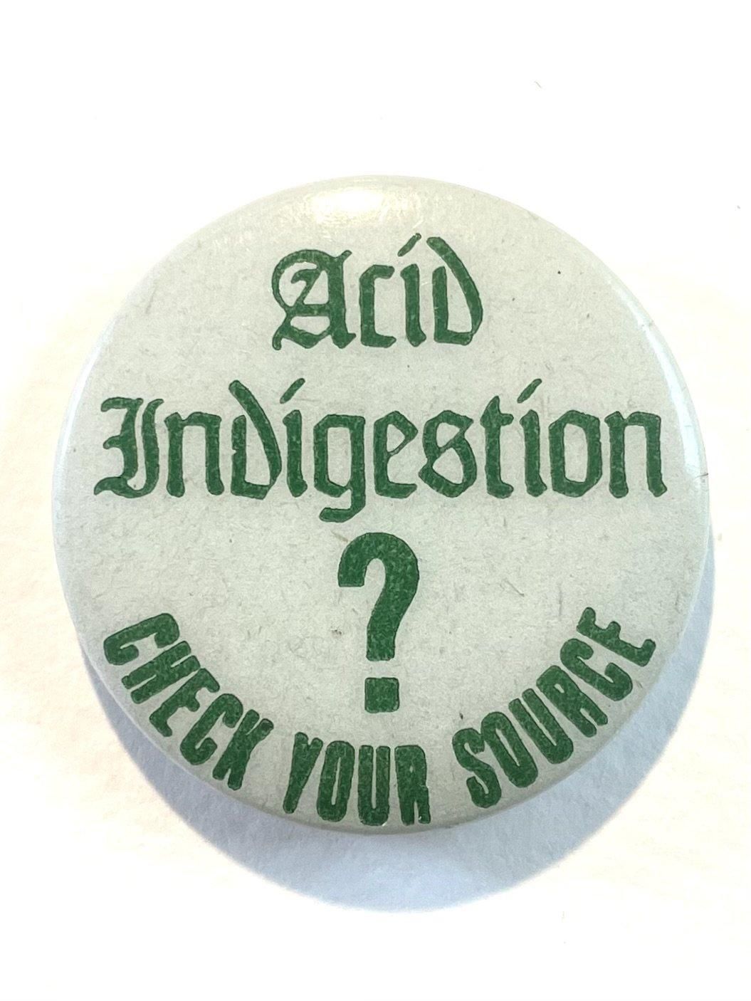 1970's "Acid Indigestion CHECK YOUR SOURCE" PINBACK BUTTON