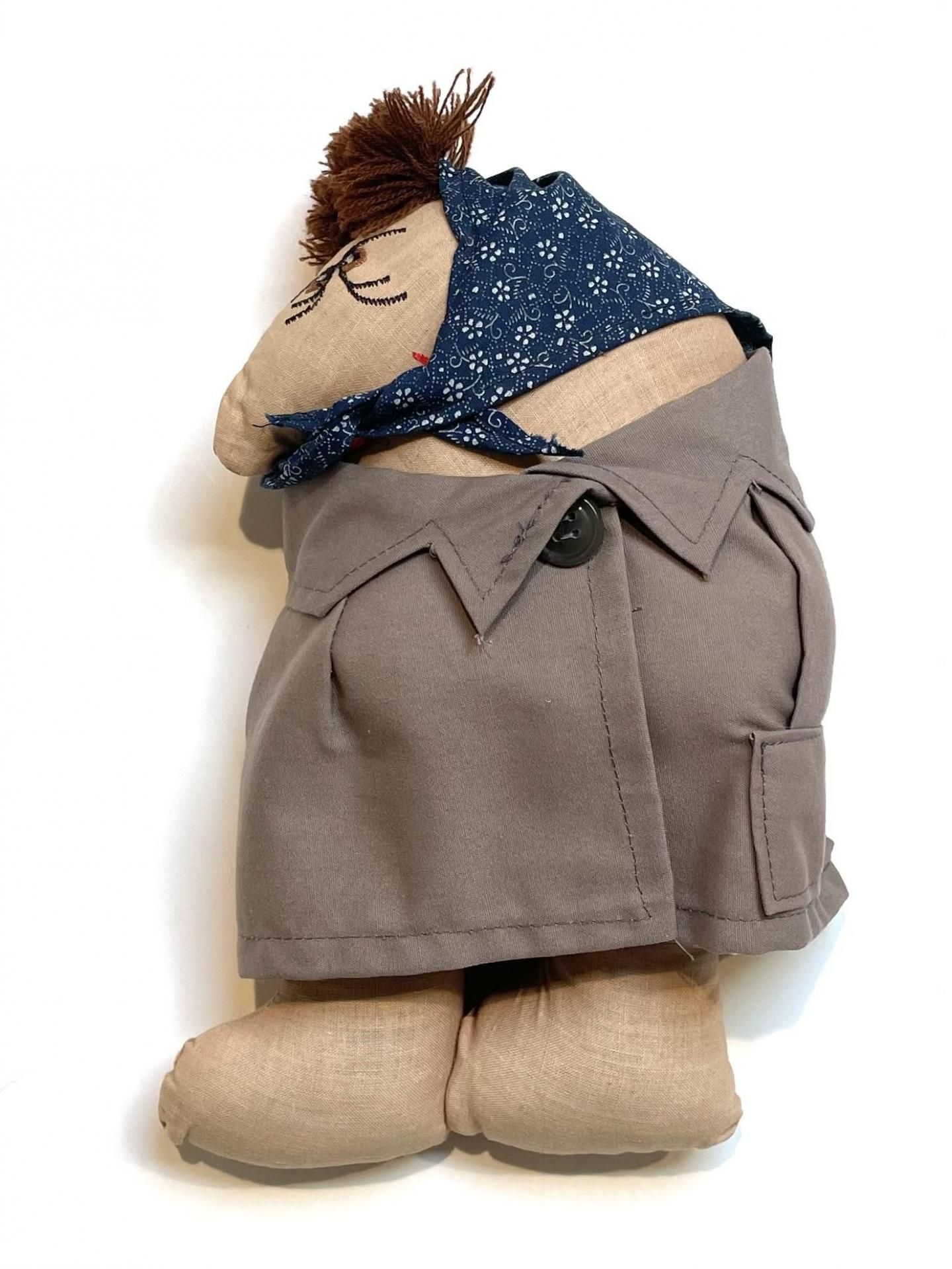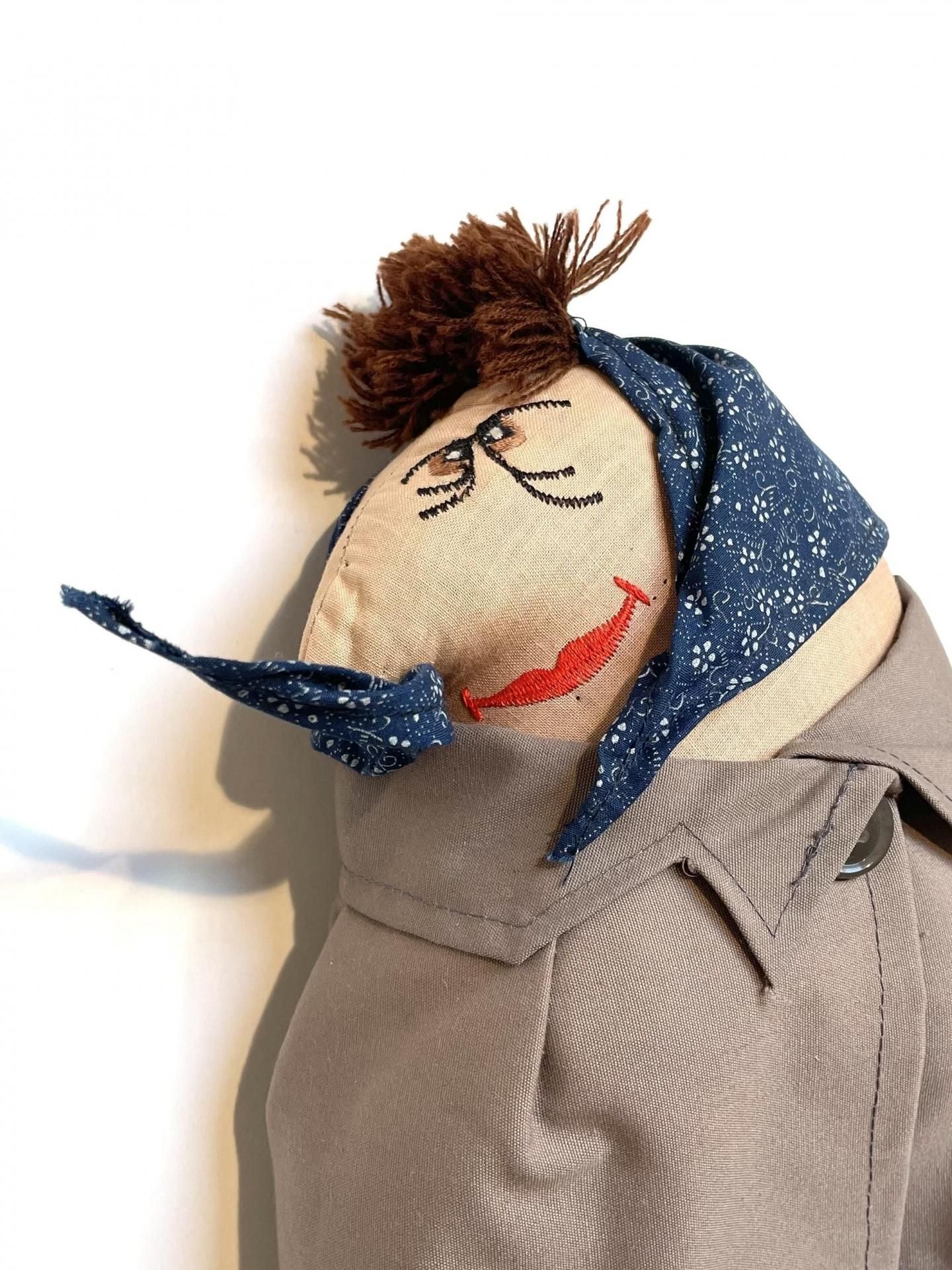 ほっかむりの下は、隈のある目元、赤い紅を引いた唇……哀愁のある顔立ちです。